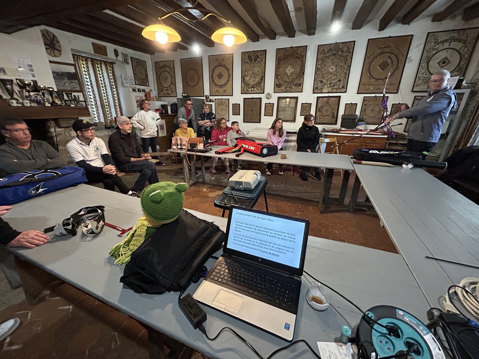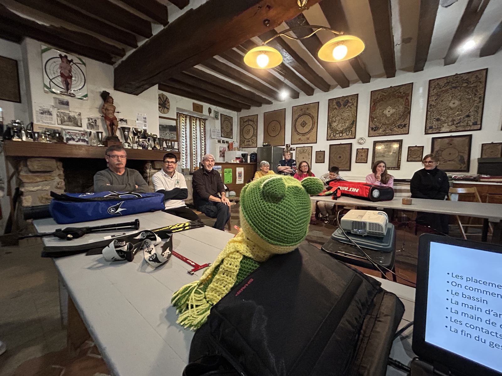 Cet après-midi, à 14h, huit archers sont arrivés au jardin d’arc pour notre stage “Position”, organisé et animé par le secrétariat de la compagnie. Après un café convivial pour bien démarrer, les participants se sont installés devant le vidéoprojecteur, prêts à écouter les précieux conseils de notre entraîneur Didier.