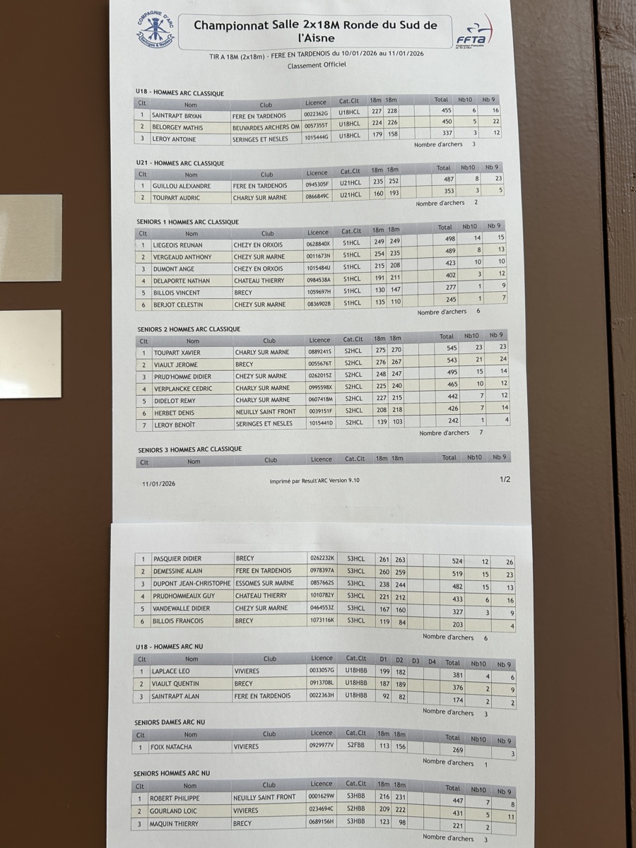 Présents les 11 et 12 janvier à la Ronde du Sud de l’Aisne, nos archers ont profité d’une compétition supplémentaire avant le départemental et le régional, avec deux podiums pour Antho (2ᵉ) et Didier P. (3ᵉ). Merci à la Compagnie de Seringes pour l’accueil et bravo à l’ensemble des participants.